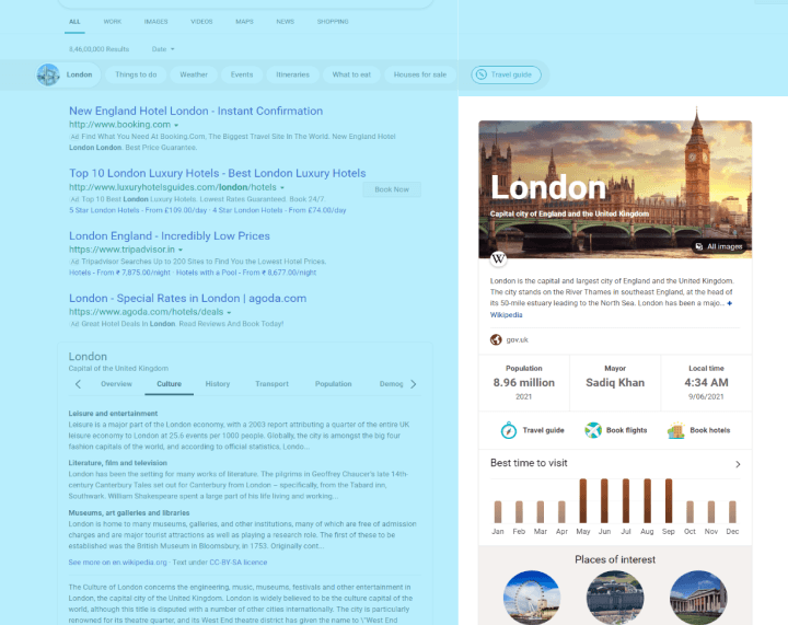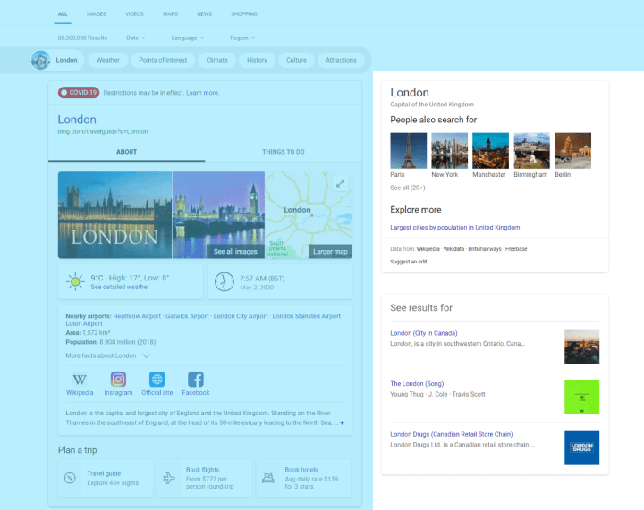 Bing surfaces knowledge cards when users search high-volume keywords — London, Michael Jackson, giraffe. These cards are the first thing hundreds of millions of users see. As part of a cross-functional team, I led the visual redesign of the knowledge card system.